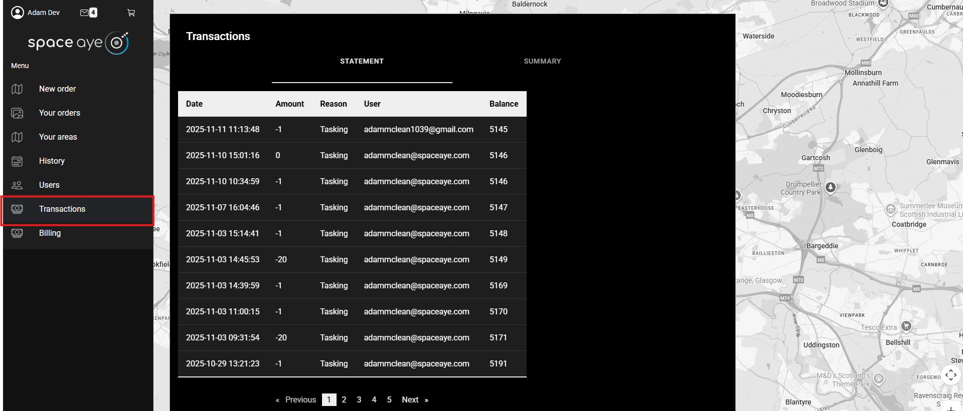 Company Admin user have access to information about all transactions made by users associated with their company. These records are read only. If you are unable to access this section and believe that you should, please contact your line manager and/or SpaceAye support to resolve this issue.