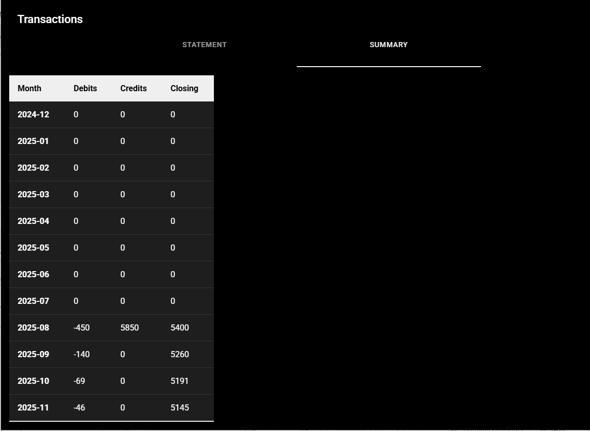 The Summary section shows an overview of your companies credit usage over the last twelve months. The record for the current month will show the month to date. Each months shows: